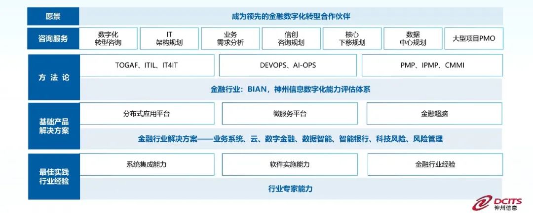 从“架构规划设计、银行系统解决方案、全适配服务、云和分布式基础设施、集成和运维服务”五大方面,形成整体的金融信创能力体系,满足金融机构全方位的信创建设需求。
